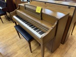 Pre-owned Kimball consolette in a warm walnut finish. Straight edges and minimal intricacies give this piano a sleek look that still fits in modern designs, and the neutral wood tone pairs with most colors. Slightly shallow key action and a neutral to slightly brighter tone. We recommend this piano for beginner pianists as an excellent starter piano, or as a functional furniture piece to complete a room.