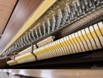 Pre-owned Wurlitzer console. This piano has a very light touch and relatively balanced tone, and is suitable for beginner to intermediate pianists in a home environment. Medium-brown walnut finish with cane music desk and queen-anne style legs.